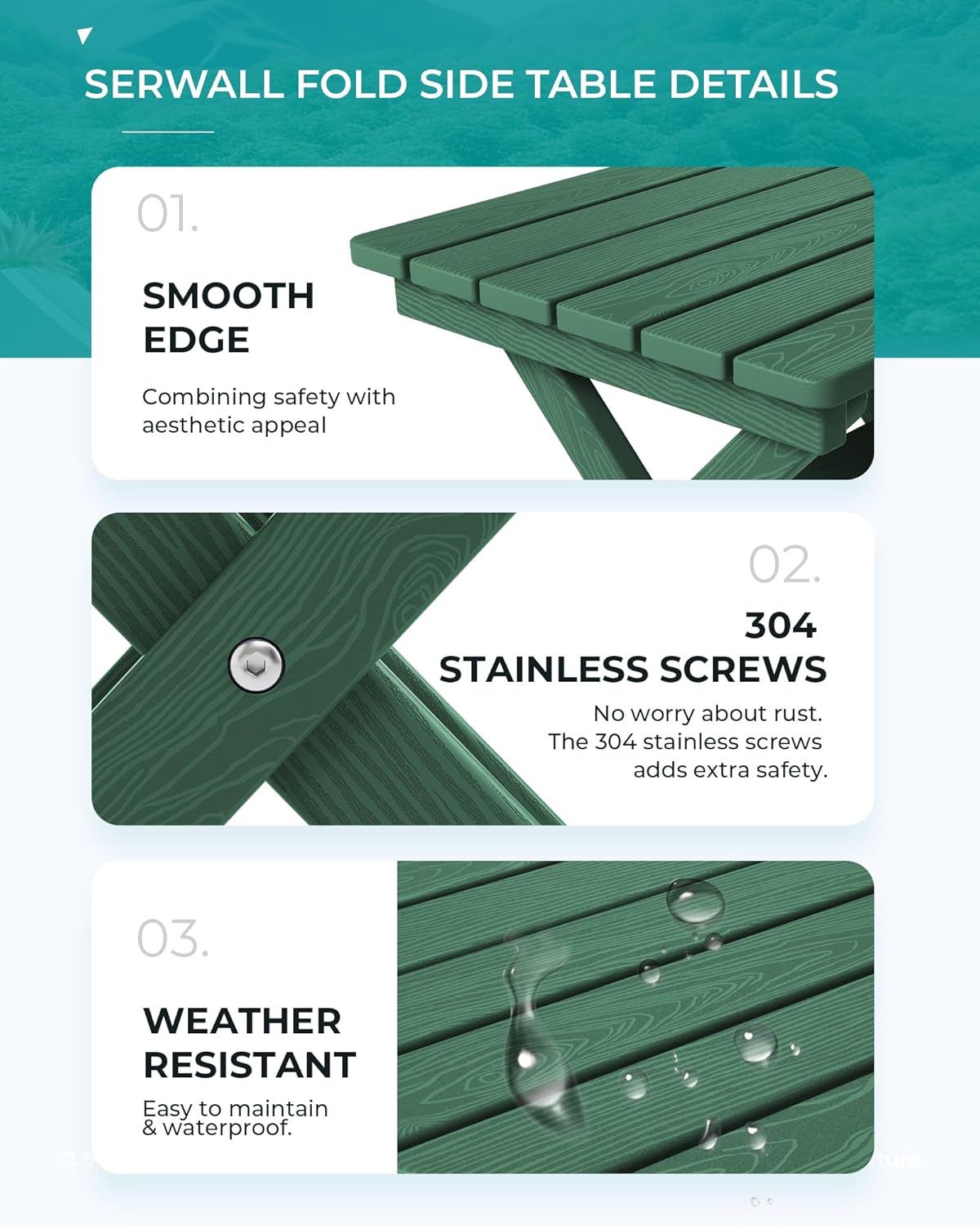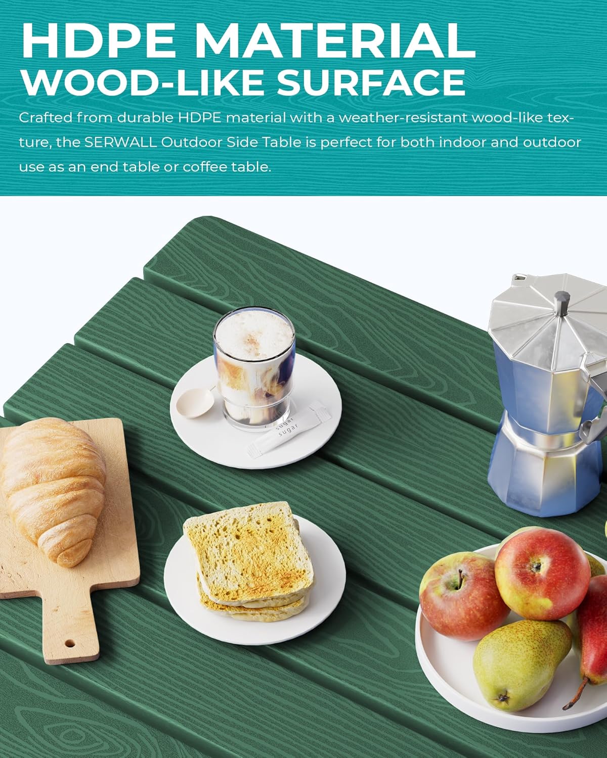 - [Premium Wood-Textured Surface] Offering the aesthetic appeal of wood without the upkeep, the SERWALL Side Table features a wood-textured HDPE surface that adds an elegant and natural touch to your outdoor decor.