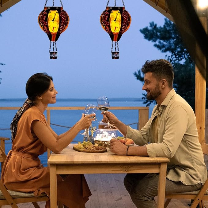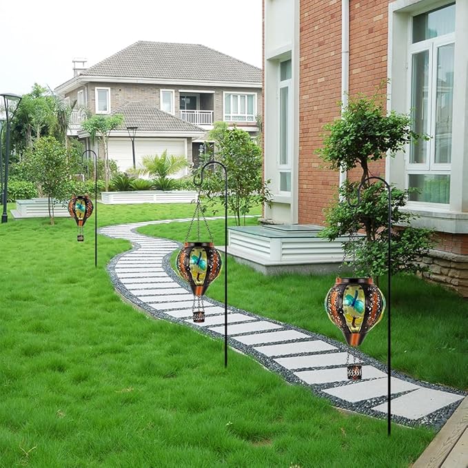 - Dragonfly Decoration: This solar lanterns is made of high-quality metal and glass, featuring a vibrant hot air balloon silhouette adorned with exquisite dragonfly patterns. At night, the dragonfly pattern of this hot air balloon solar lantern adds a playful touch to the garden or terrace.