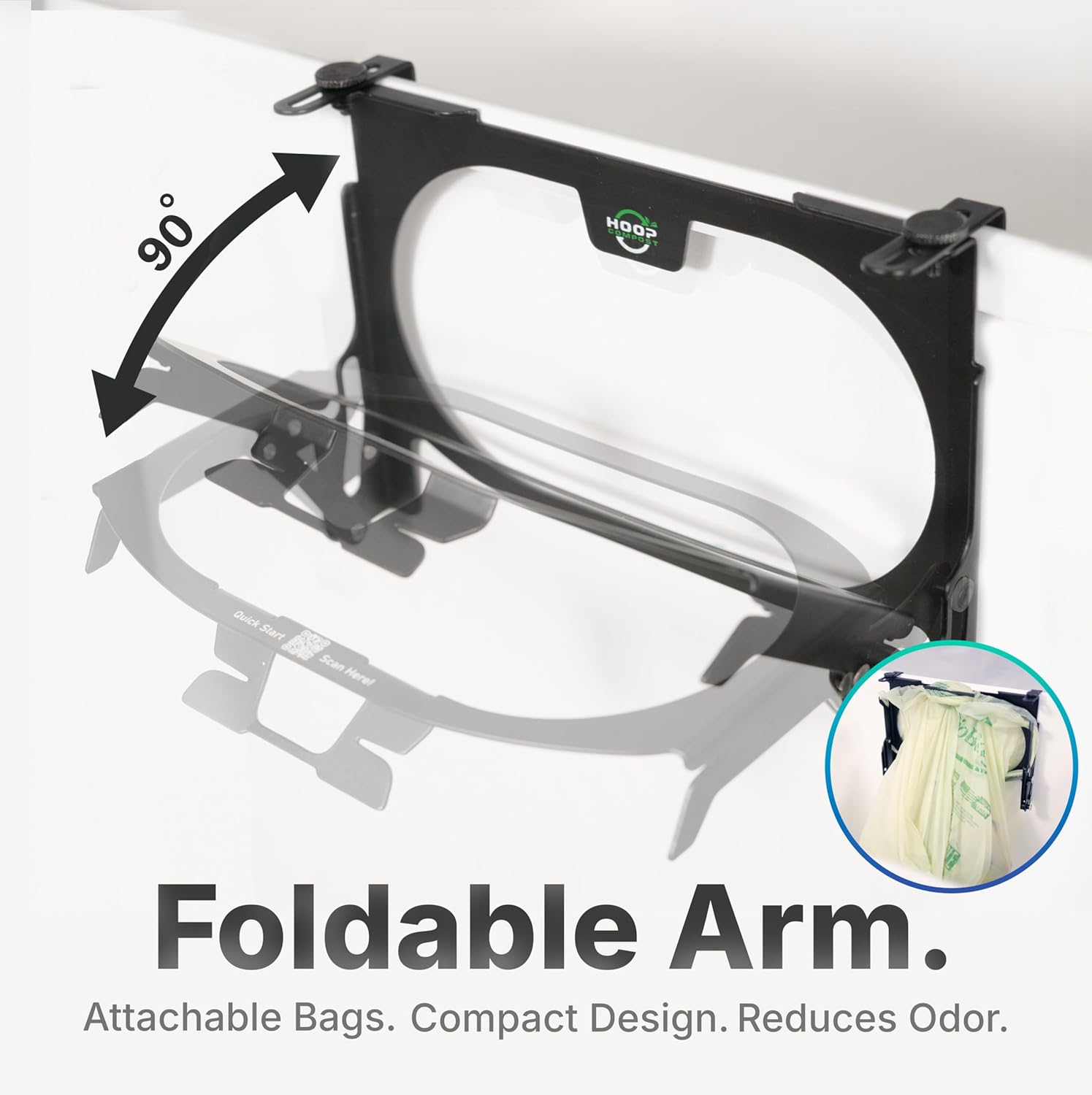 - ✔ Innovative Liftable Arm for Odor Control: Eliminate odors with HOOP’s lift-up arm mechanism. When not in use, simply lift the arm to seal off the compost bag and trap unpleasant smells—keeping your kitchen smelling fresh while your trash stays out of sight.