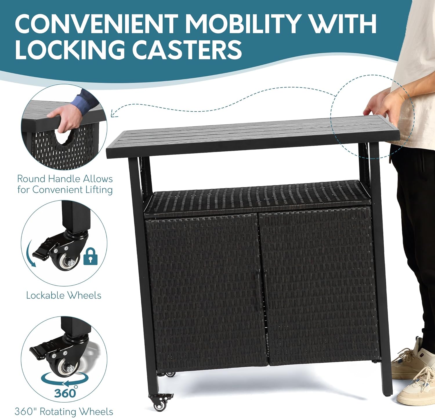 Outdoor Indoor Storage Cabinet with Rolling Wheels, Patio Serving Cart with Bar Table and Wicker Cabinet, Kitchen Island Prep Table, Black