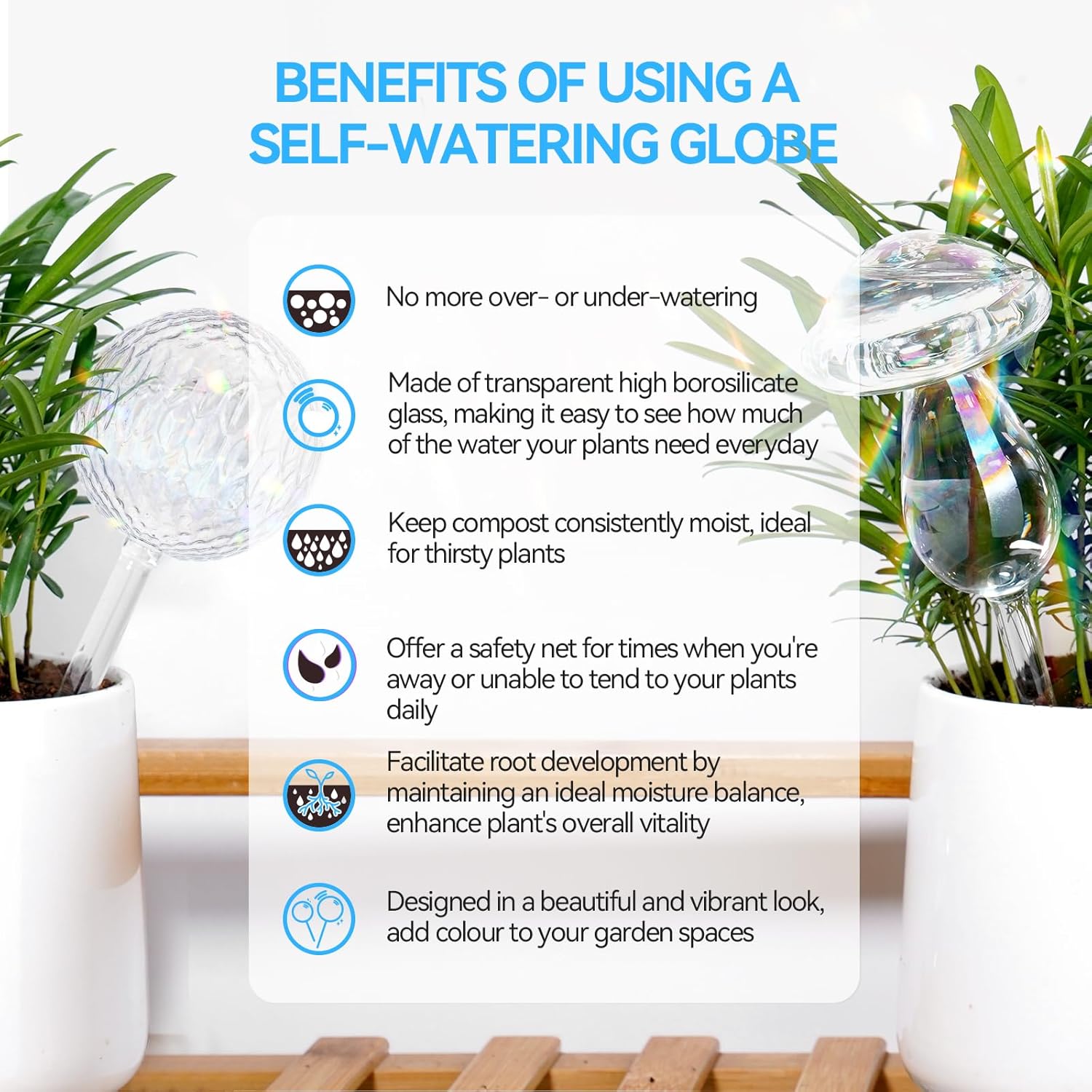- 【Easy-to-Use & Friendly Design】1. Water the plants before using these watering globes 2. Fill the bulb up with water 3. Turn it upside down and push the long thin neck of the globe into the soil