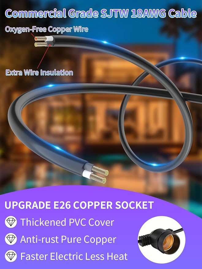 - 27FT S14 OUTDOOR STRING LIGHTS :Totally with 10 sockets(E26 Base),11 plastic clear S14 Bulbs( 1 spare),Shatterproof,save over 90% energy over incandescent bulbs.The 2700K soft warm lighting is perfect for creating romantic atmosphere for wedding, warm family reunion,party and etc