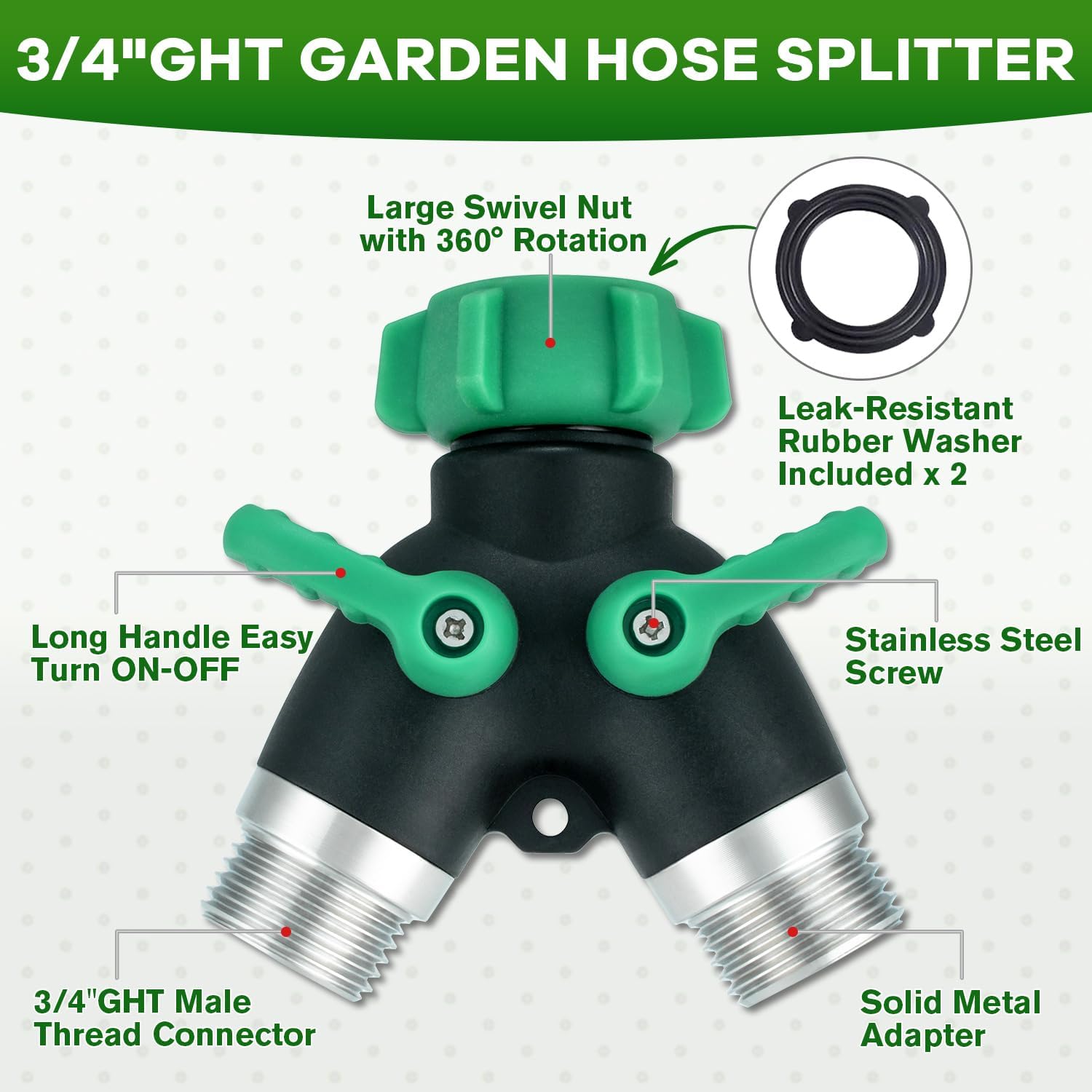- 【Dual Outlet Water Flow Management】Garden hose y splitter 2 way are suitable for American standard-sized faucets,designed for high water pressure,and can independently control two water pipes.Effortlessly split water flow between two hoses.
