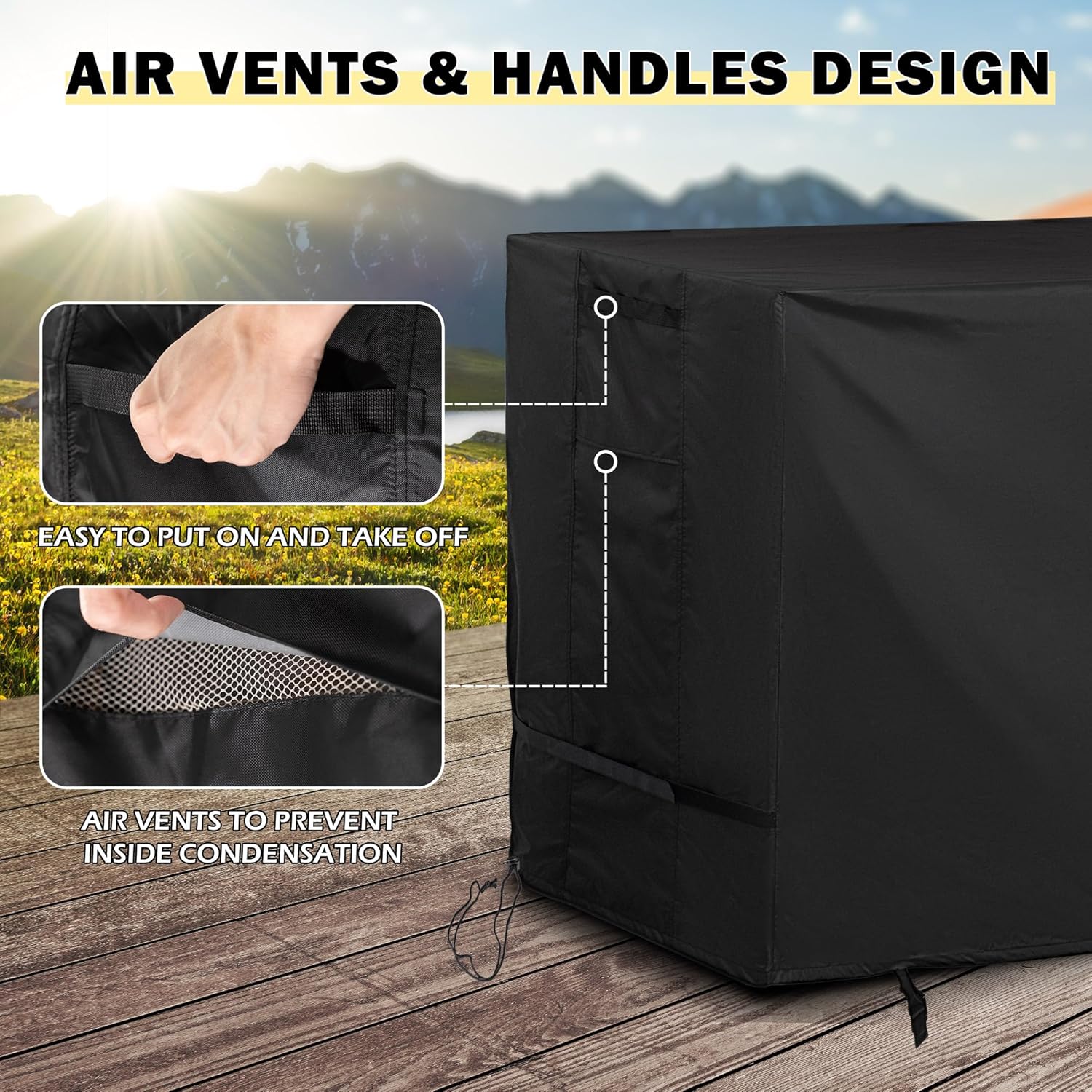 - AIR VENT & HANDLES – The design of the air vents can improve the air flow to prevent inside condensation, keeping your outdoor kitchen cabinet dry and clean. Two reinforced handles make the cover easy to put on and take off