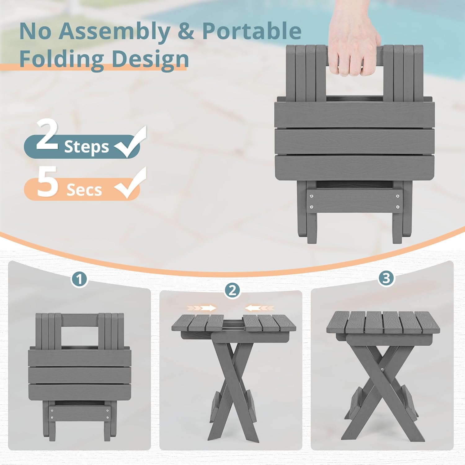 - 𝗙𝗼𝗹𝗱𝗮𝗯𝗹𝗲 𝗢𝘂𝘁𝗱𝗼𝗼𝗿 𝗦𝗶𝗱𝗲 𝗧𝗮𝗯𝗹𝗲: The LUE BONA adirondack side table cleverly folds down to a smaller size, offering outdoor lovers an ideal way to maximize space when not in use