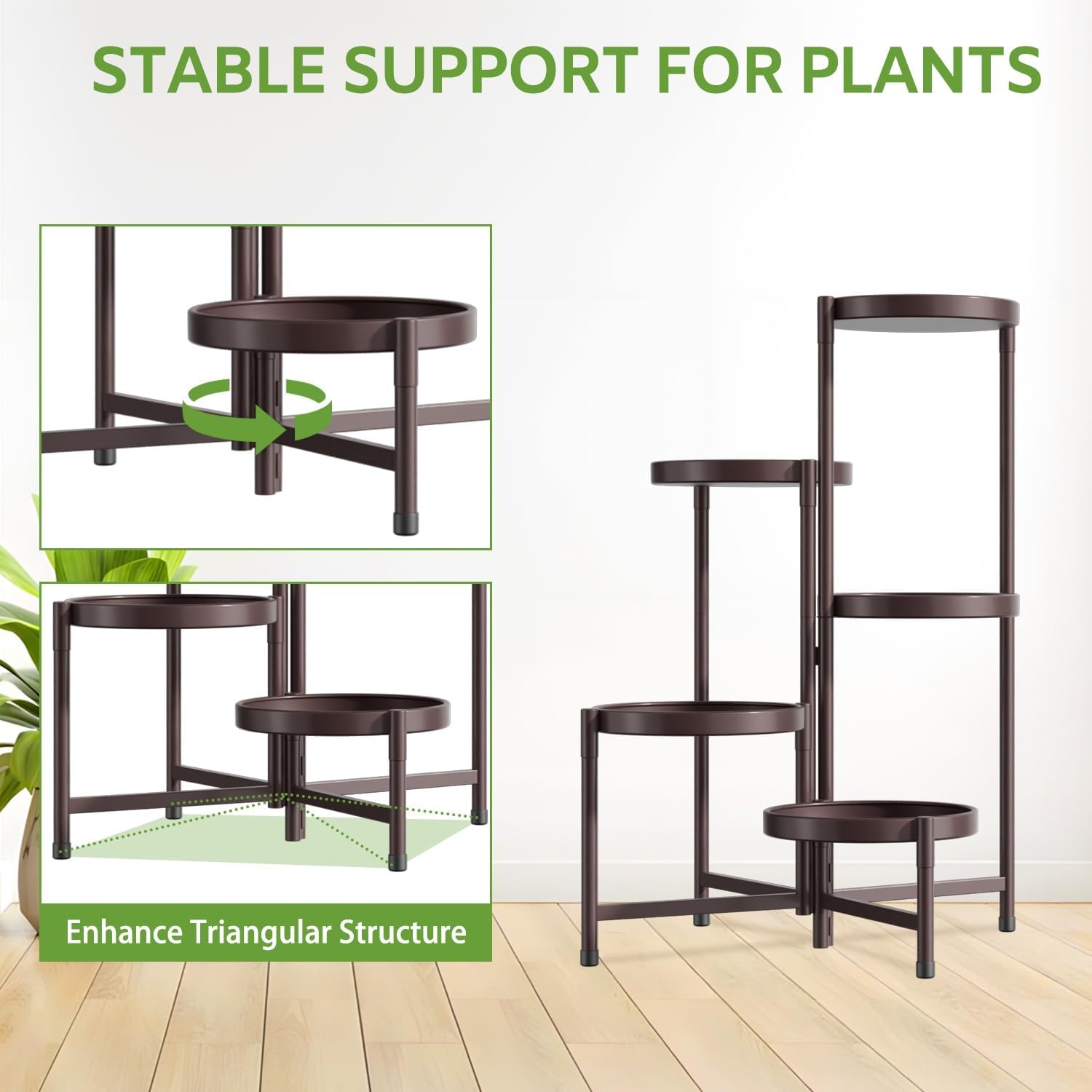 - Easy to Assemble Flower Shelf: This plant stand indoor tall can be easily assembled in less than 5 minutes without the use of any tools. The plant holders indoor stand's ground-contact feet are equipped with protective rubber foot pads that enhance stability while protecting the ground from iron scratches