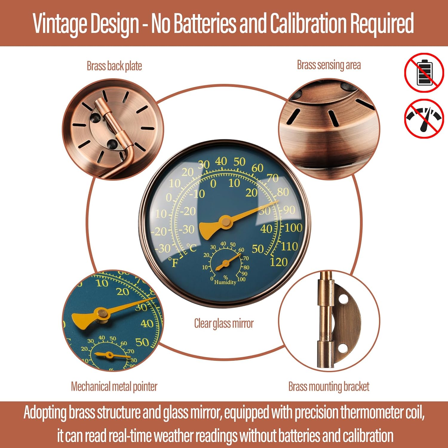 - Vintage Design: Adopting brass structure and glass mirror, equipped with precision thermometer coil, it can read real-time weather readings without no batteries required and calibration
