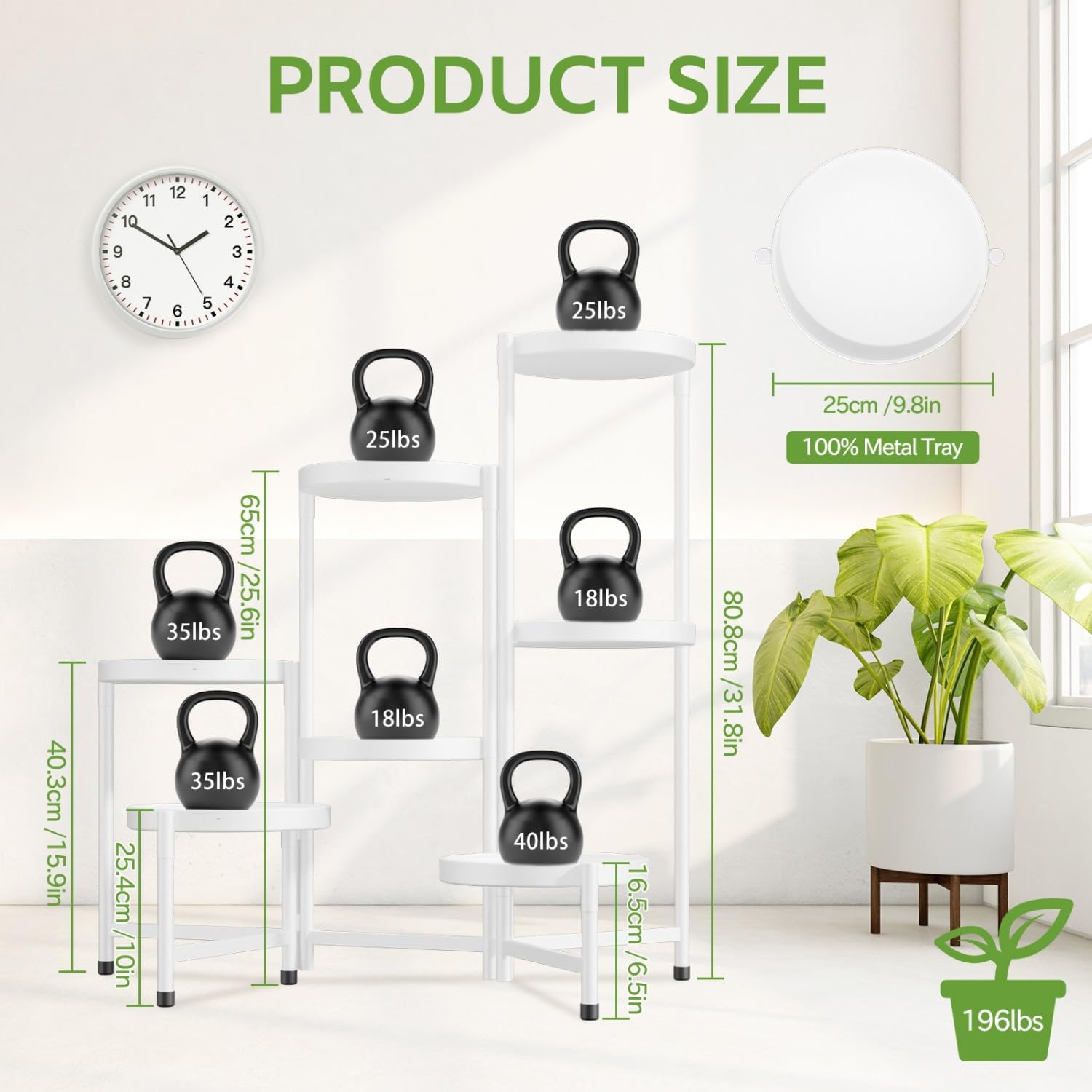 - 9.8 In Extra Wide Round Tray: This corner plant stands for indoor plants has been upgraded with an enlarged 9.8-inch diameter metal round tray with a total weight capacity of 196 lbs for large & heavy duty potted plants. The tiered plant stand is made of sturdy and durable iron with a waterproof and rustproof white lacquer finish, making it suitable for indoor and outdoor use