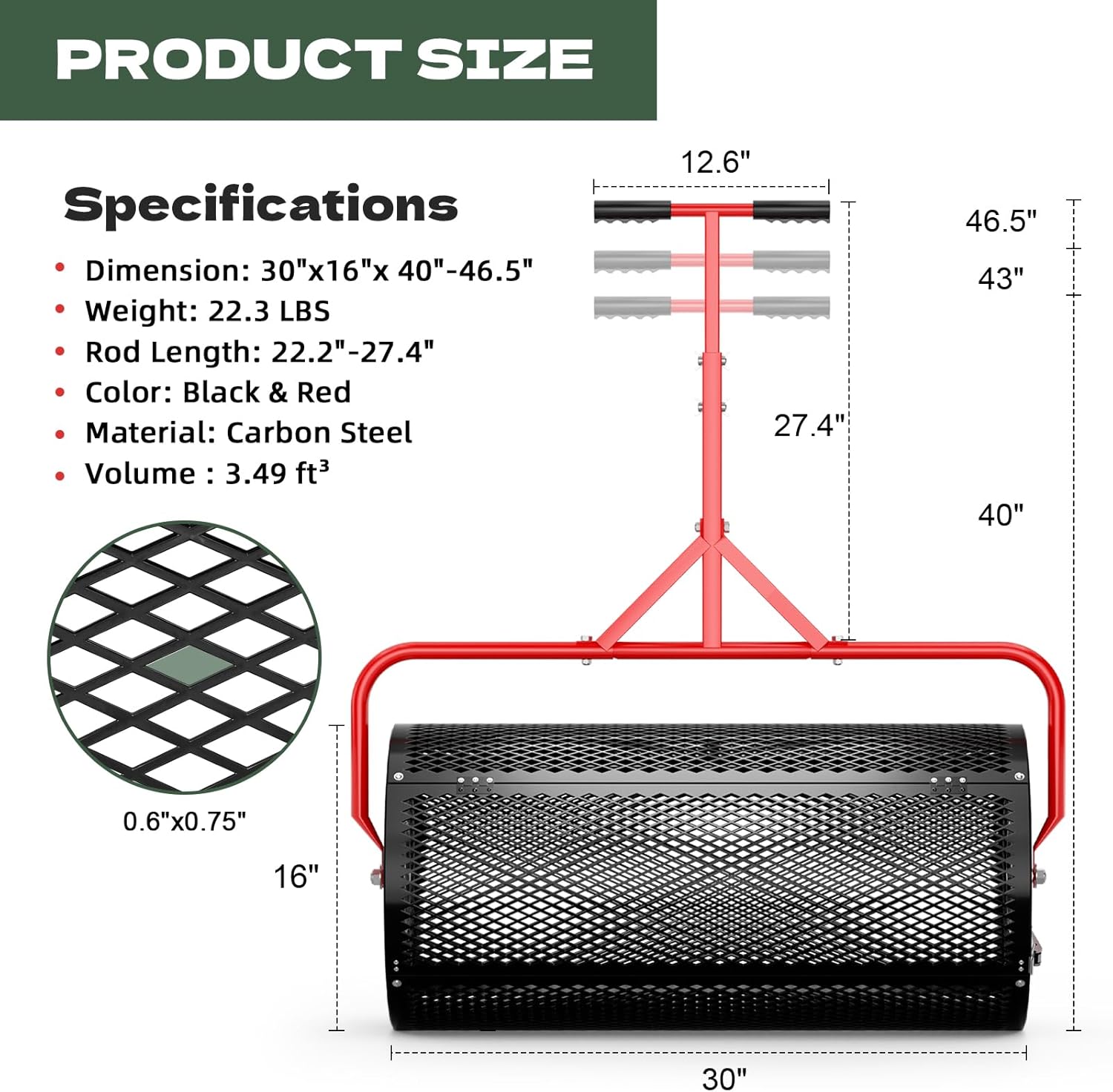 - [High-Efficiency Design - 3.49 Cubic Feet] This heavy-duty 3.49 cubic feet (≈200 lb) compost spreader delivers 400 sq ft of coverage per load, perfect for lawns up to ¼ acre. Its 30-inch wide roller ensures even distribution of peat moss, compost, or organic pellets, while the reinforced diamond-pattern mesh provides optimal filtration.