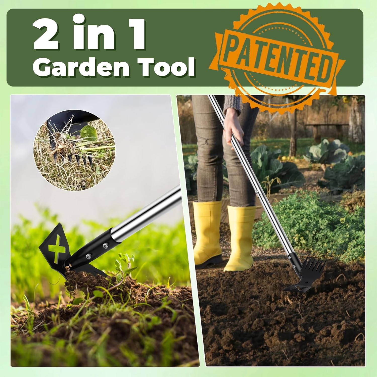 - [2 in 1 Garden Tools]: The weed puller tool has two parts, one with 6 sharp tine that can penetrate deep into the soil to pull out the unwanted weeds, and the other with a sharp edge that can be used as a garden hoe to remove a large area ofweeds or level the soil. Please pay attention to the size of the weeder head to make sure it meets your needs, this exquisite head is perfect for compact gardens. It is not easy to damage surrounding flowers or plants when weeding or loosening the soil