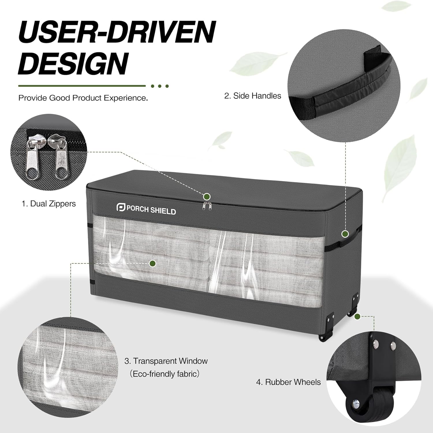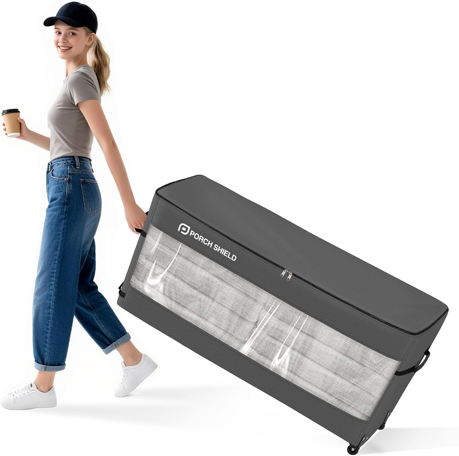 - 【Dimensions】 Porch Shield rolling cushion storage bag with wheel is 62"L x 20"W x 28"H, which fits patio chair cushion, pillow, 9 FT Christmas tree, festival decoration and more. Large cushion bag can hold 16 cushions as reference and more depending on thickness.