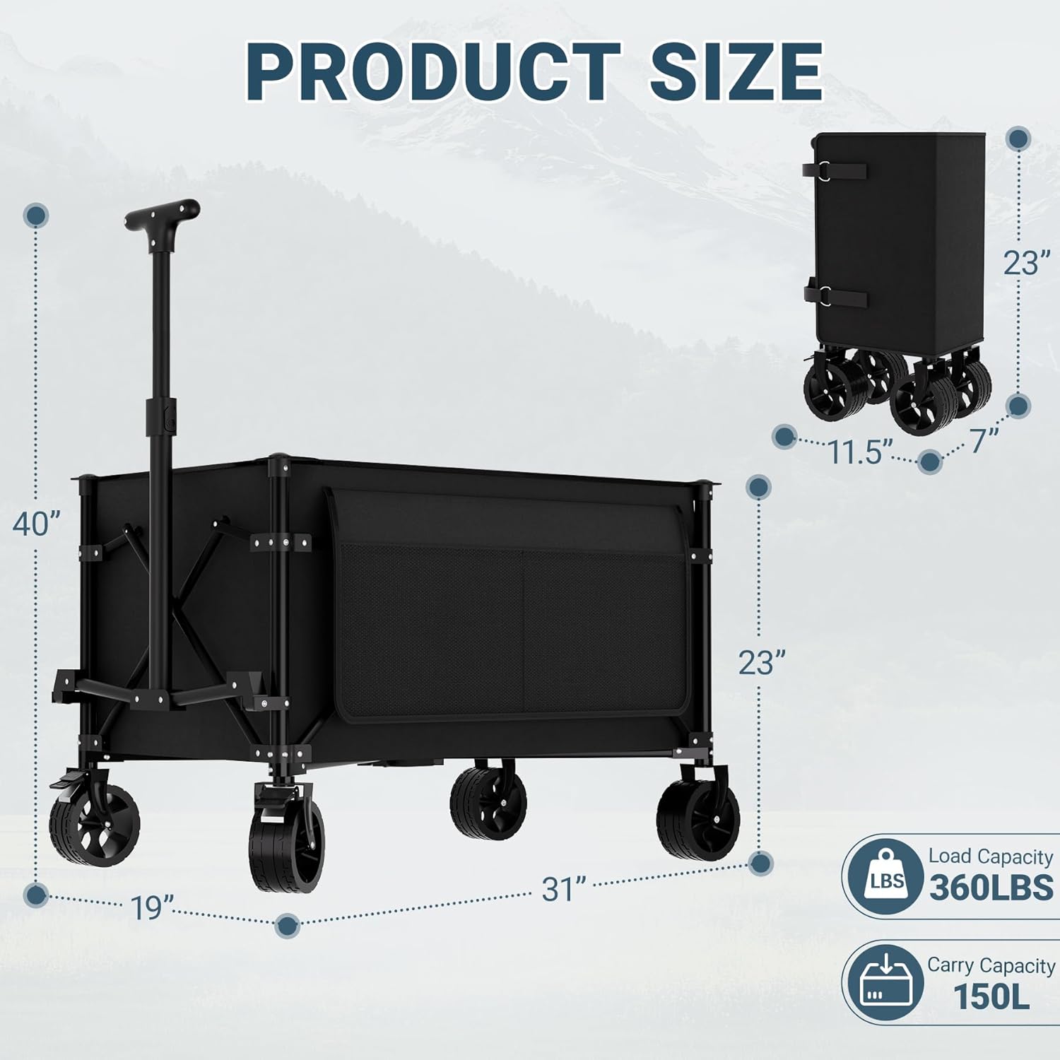 Favoyard Collapsible Wagon Carts Foldable 150L & 360LBS Folding Wagons w/All-Terrain Wheels & Brakes Portable Lightweight Utility Shopping Cart for Beach Grocery Sports Garden Camping Outdoor, Black