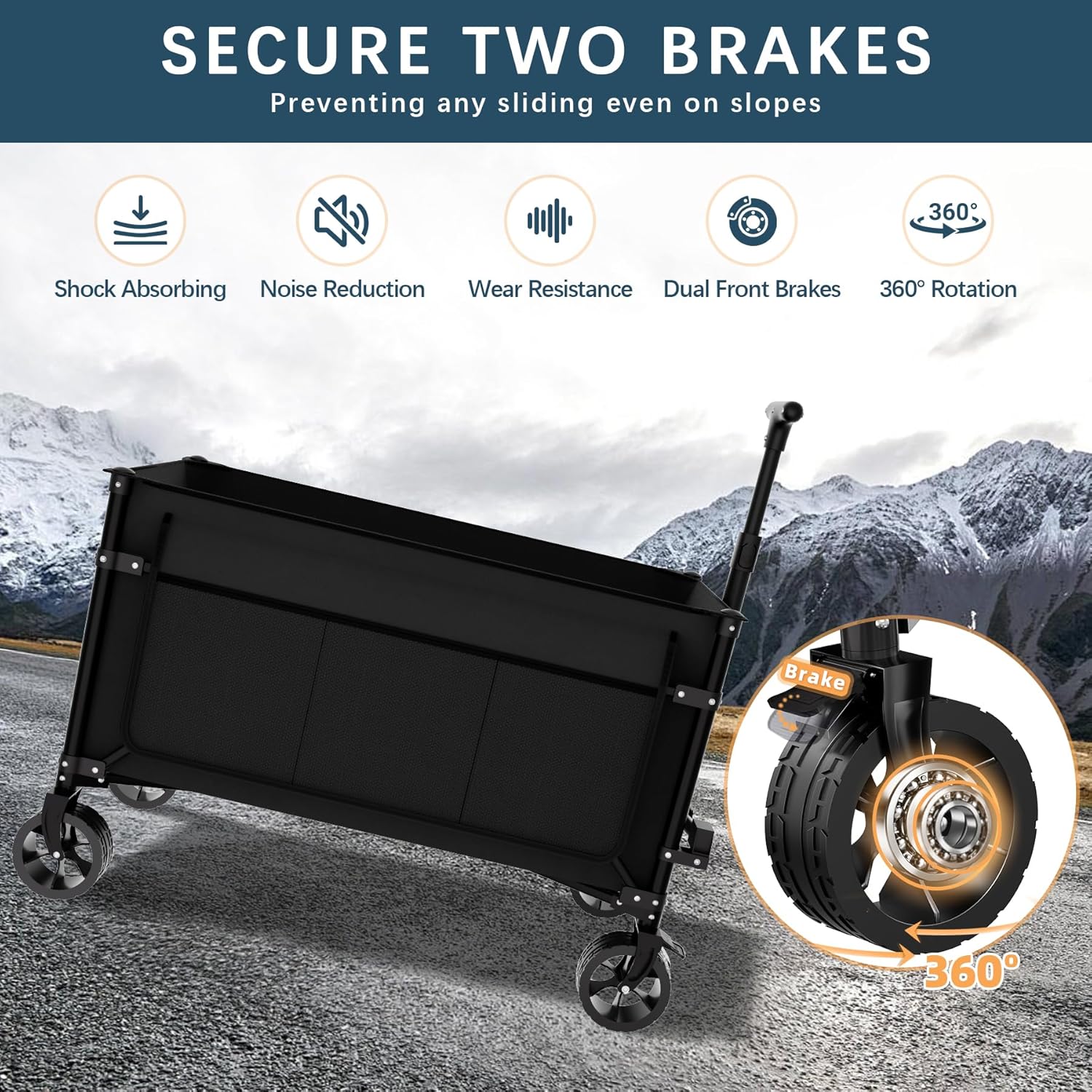 - 【All-Terrain Wheels with Brake & Adjustable Handle】 - The folding wagon comes with two front 360° swiveling off-road wheels that have brakes, ensuring a smooth pull and easy transport on most kinds of ground surfaces like the cobbled road, asphalt, dust, and grass. The adjustable handle features rebound function will not drop to the ground, no need to bend down and pull up the handle!