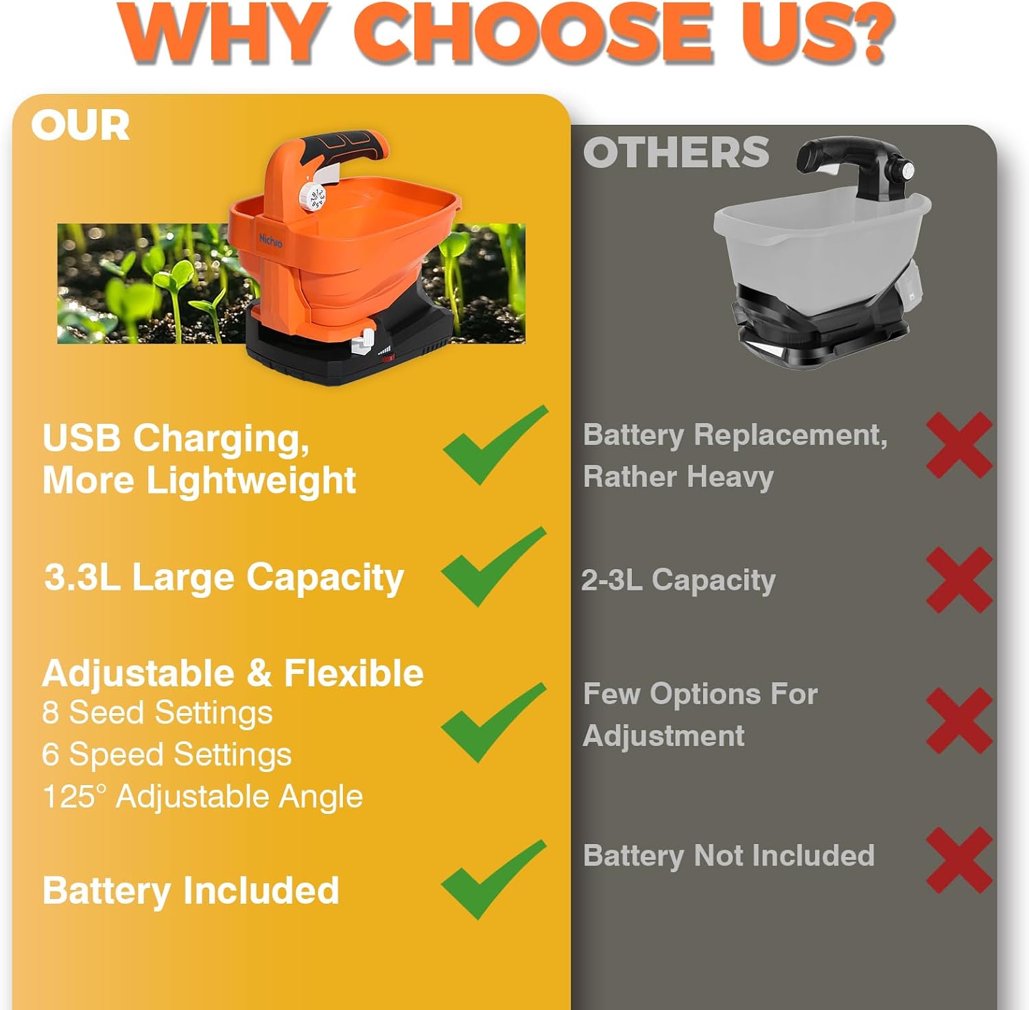 Seed Spreader, USB Rechargeable Handheld Grass Seed Spreader, Fertilizer Spreader with 8 Seed Settings & 6 Speed Levels, Lawn Spreader for Seed, Feed, Weed, and Salt (Battery Included)