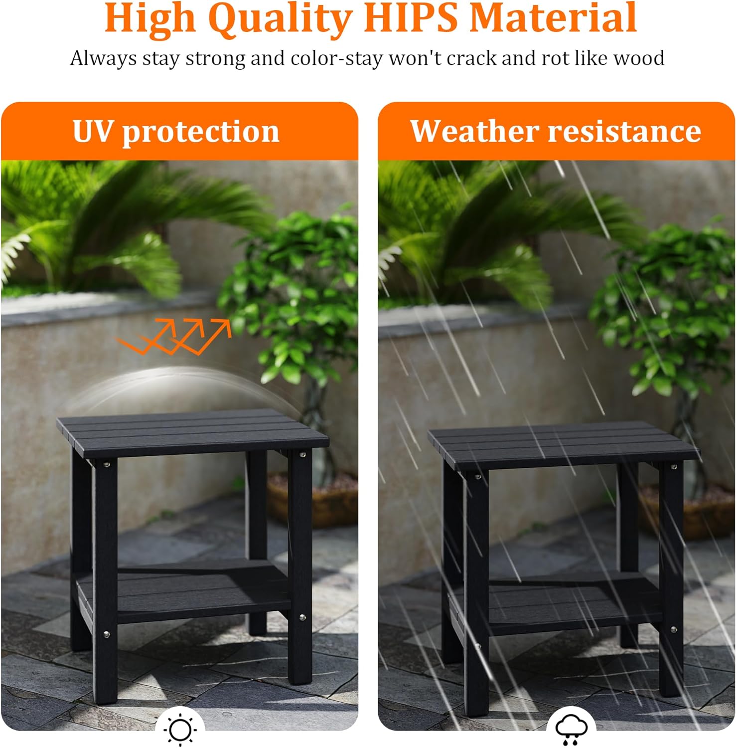 - DOUBLE STORAGE SPACE: This outdoor side table features a double-layered design, offering ample space for books, drinks, or decor, keeping your essentials organized and within reach.