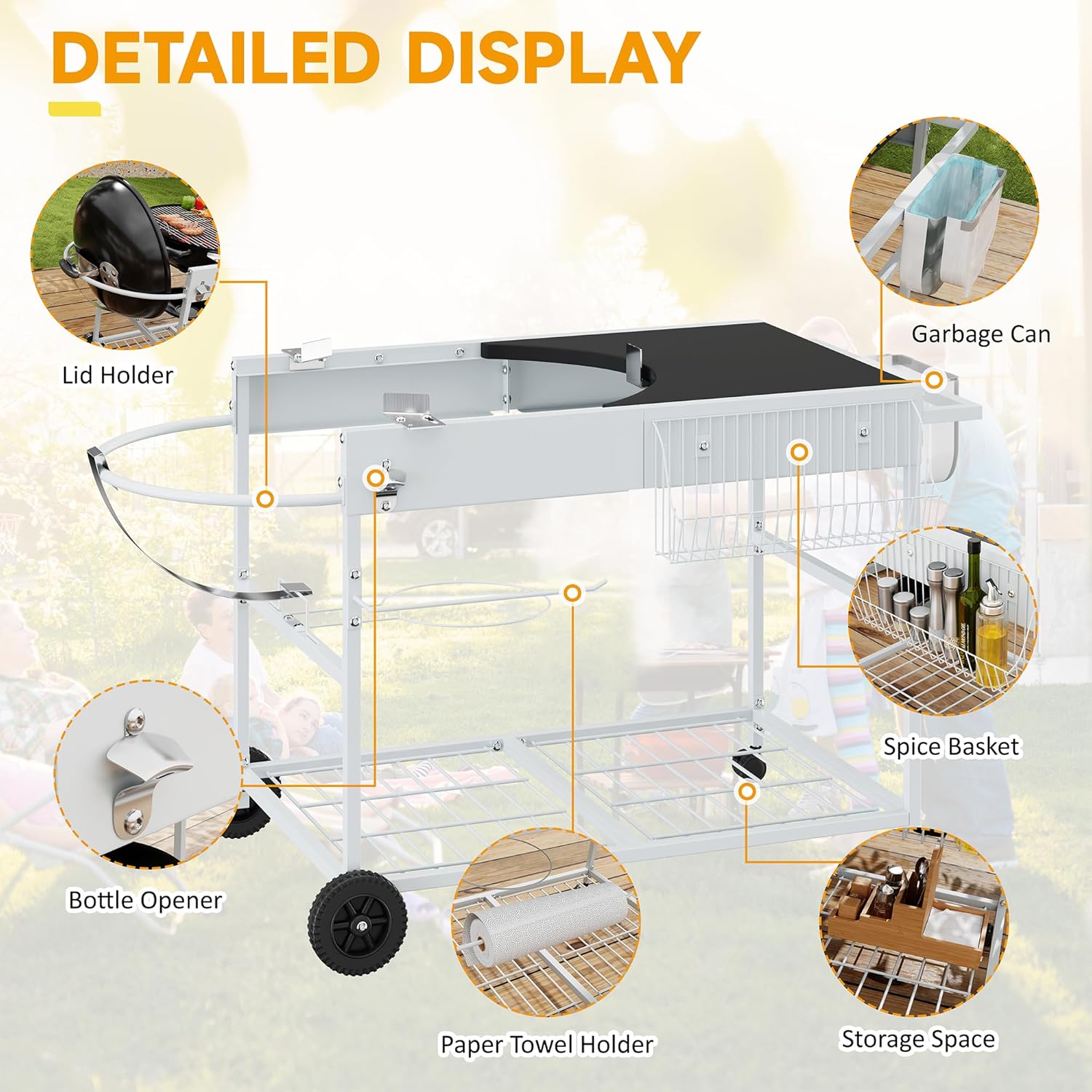 JY QAQA Grill Table for Weber 22" & 18" Original Kettle, Stand Cart for Jumbo Joe, Master-Touch, Performer Charcoal Grills with Sliding Lid Rack, Spacious Surface, Lockable Wheels for Outside